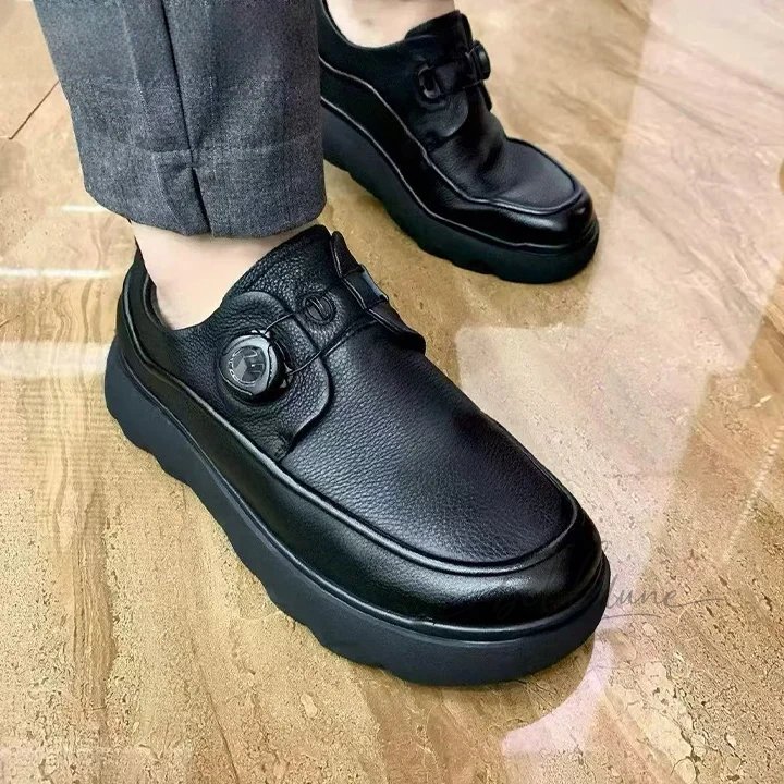 Modern British-style loafers crafted from premium cowhide leather with a convenient automatic buckle closure. Lightweight, breathable, and non-slip rubber sole with a comfortable 3-5 cm heel — perfect for daily wear and casual business looks.