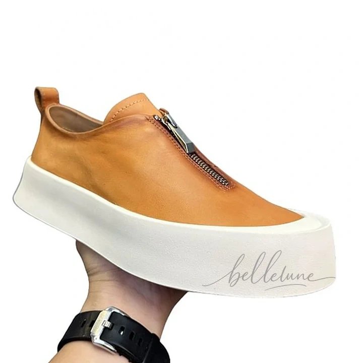 Handmade Retro Cowhide Zipper Loafers – Chunky Platform British Style Casual Board Shoes