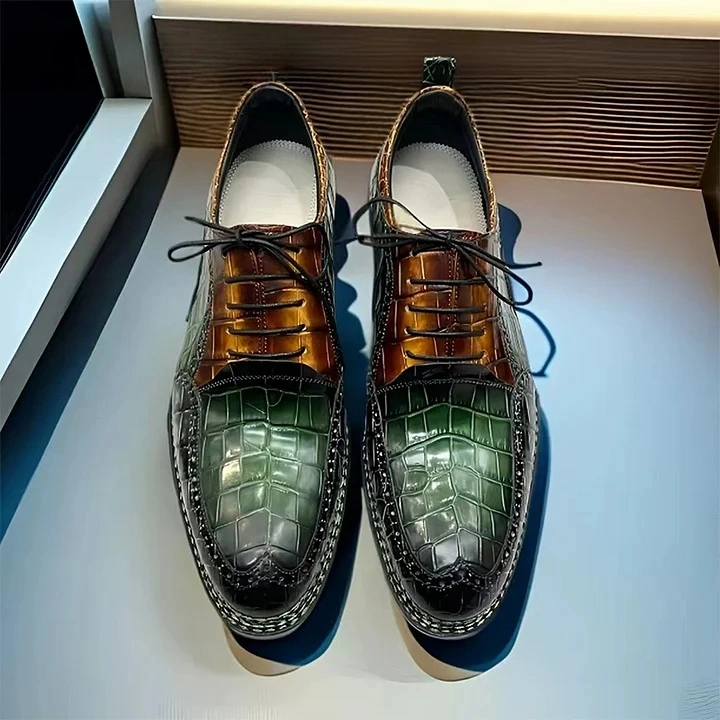 UpperCrocodile Leather(South Africa)InsideDrum-Dyed CowhideInsoleDrum-Dyed CowhideSoleCowhide(Italy)Tech.Goodyear, Fiddle Waist, Norwegian SeamColoring Tech.PatinaModel: Oxford Style, British Style, Gentleman Style, Business StyleShoe Toe: Squre ToeHeight Of Heel: 3CMCharactistics of Sole: Leather Sole from Cuofificio Bisonte In ItalyTip 1:Crocodile skin has the following advantages:- Tough texture: The fiber structure of crocodile skin is very dense, with high strength and good wear resistance. Products such as leather goods made from it are durable, capable of withstanding relatively large pulling forces and pressures without being easily damaged.- Unique texture: Crocodile skin has natural and unique textures, such as bamboo joint patterns, circular patterns, etc. These textures are beautiful and full of texture, with extremely high recognition, which can showcase a unique fashion charm and add a sense of luxury to the products.- Good gloss: After appropriate treatment, crocodile skin can present a natural and charming gloss. This gloss is long-lasting and not easy to fade, making the products look more high-end.- Good breathability: Although crocodile skin has a tough texture, it still has a certain degree of breathability, which can keep the skin dry. It will be relatively comfortable when wearing items such as shoes made from crocodile skin.- Rare and precious: Crocodiles are protected animals, and the acquisition of crocodile skin is strictly restricted. Therefore, crocodile skin products are relatively rare and have high collection value and investment value.Tip 2:The interior is wrapped in cowhide and treated with a water - dyeing process. It has a soft texture, fine pores, and is sweat - absorbing and breathable, keeping the feet fresh even after long - term wear.Tip 3:Goodyear welt construction is a traditional shoe-making process. It connects the upper, insole and outsole together by using a welt, which has good durability, water resistance and comfort, and is often used in the production of high-end leather shoes.Tip 4:The Patina process for leather shoes is a special technique used for the surface treatment of leather shoes. It aims to create unique color changes and textures on the surface of leather shoes through manual means, so as to achieve a retro, personalized or artistic effect.Tip 5:The benefits of Norwegian seam are as follows:- Neat and aesthetic appearance: The seam allowance is wrapped inside, with no frays visible on the surface, featuring smooth lines that are suitable for clothing with high aesthetic requirements.- Durable and firm: The sewing method makes the joint stronger and less prone to unraveling, especially suitable for frequently rubbed areas such as jeans and outdoor clothing.- Reduced friction sensation: The internal seam allowance is flat, preventing skin irritation when worn and enhancing comfort.- Enhanced fabric texture: The fine craftsmanship makes the clothing appear more delicate, improving the overall quality.