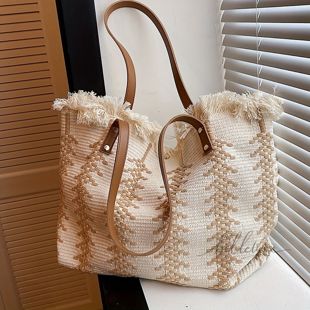 Straw Fringed Large Capacity Tote Bag, Lightweight Fashion Shoulder Bag, Exquisite Summer Beach Bag