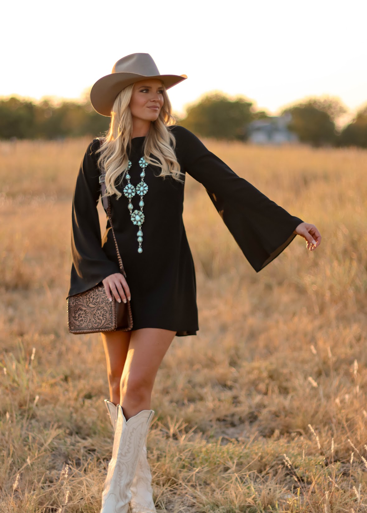 This black boat neck bell sleeve bias mini dress captures quiet, effortless romance — a softly draped silhouette that skims the body with graceful flow and subtle drama. Smooth, lightweight fabric in deep black, cut on the bias for fluid movement, featuring a wide boat neckline, dramatic bell sleeves, and a flirty mini length, creates a look that’s feminine, timeless, and quietly captivating.