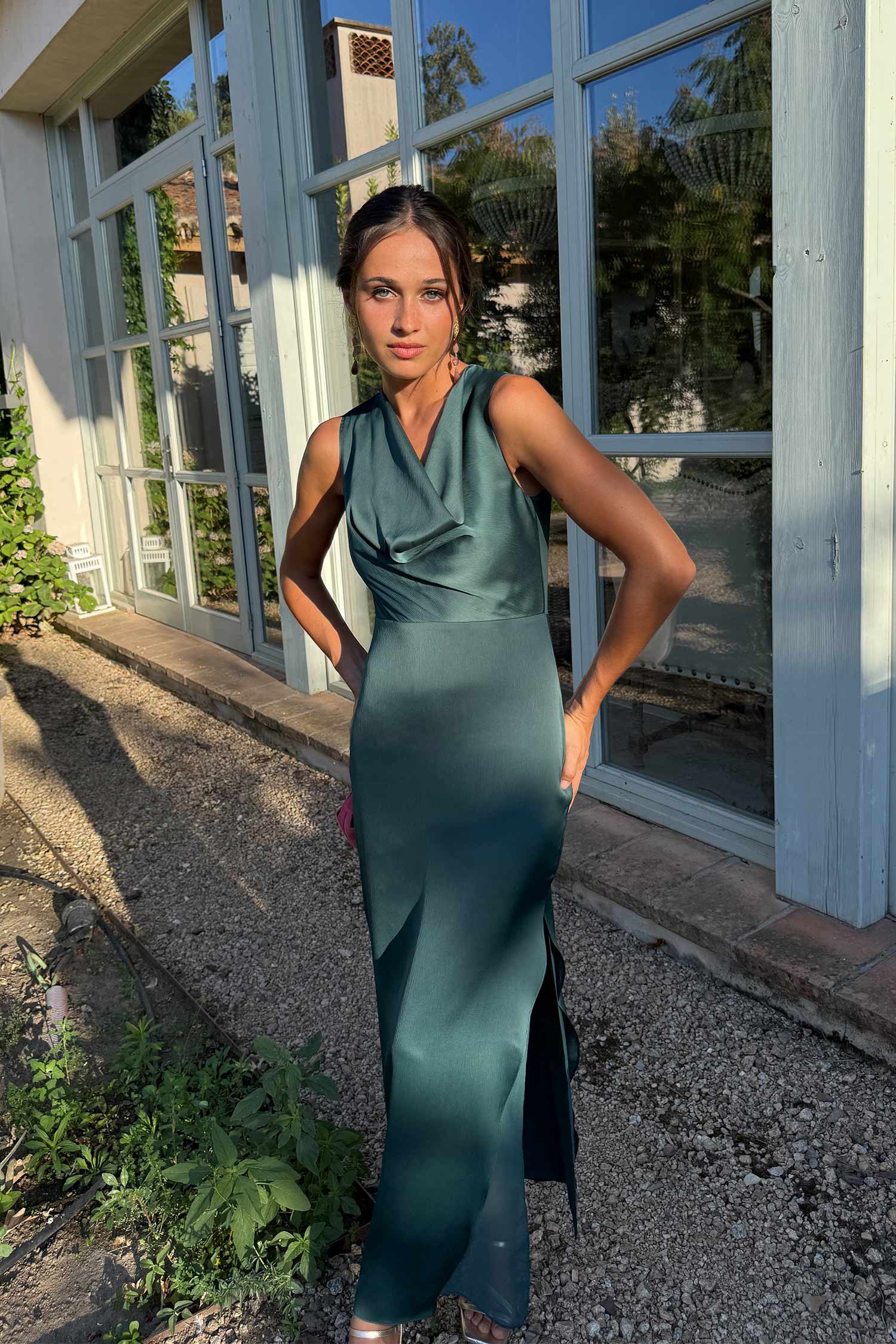 Lightweight and fluid, it's made for moments that shine: summer evenings by the sea, garden parties with friends, beach weddings, or simply days when you want to feel effortlessly elegant. The deep petroleum green tone layers beautifully with heels, jewelry, or a light shawl when the night cools.