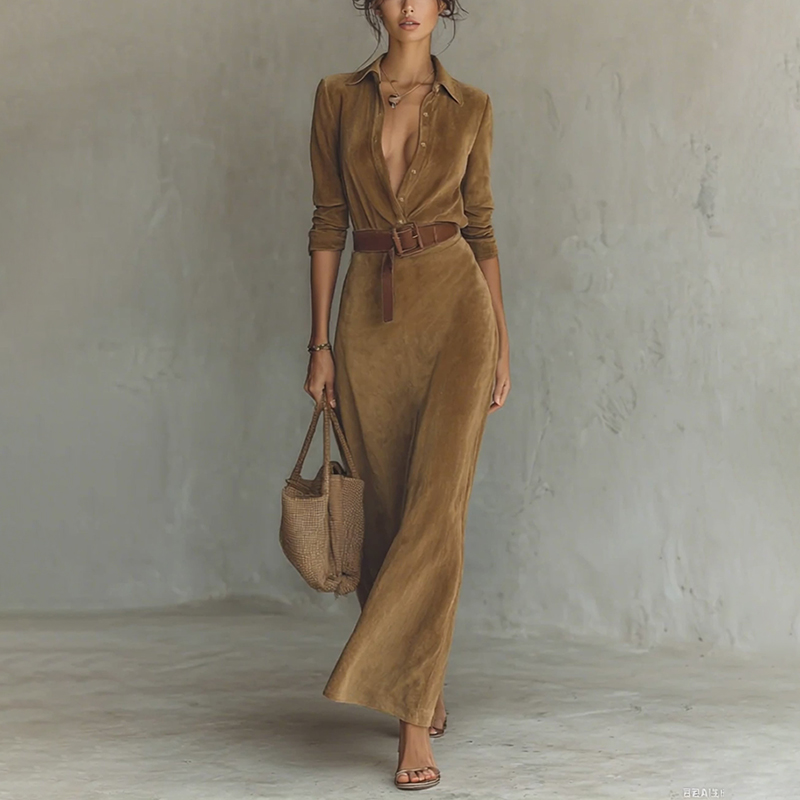 🤎 Western Retro Suede Dress – Color Block & Buttoned Placket
