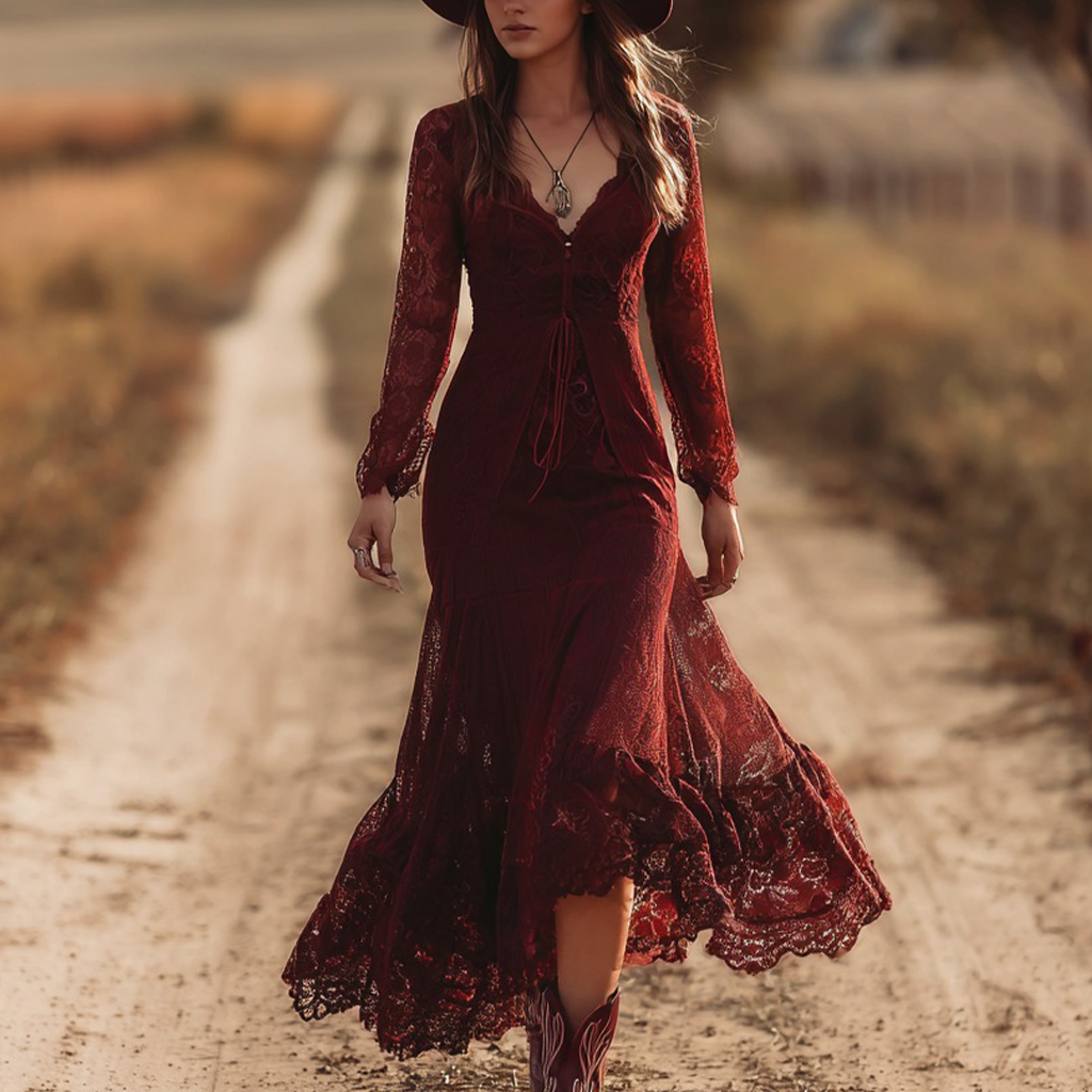 ❤️ Women's Vintage Elegant Wine Red Lace Dress — Boho Western Charm